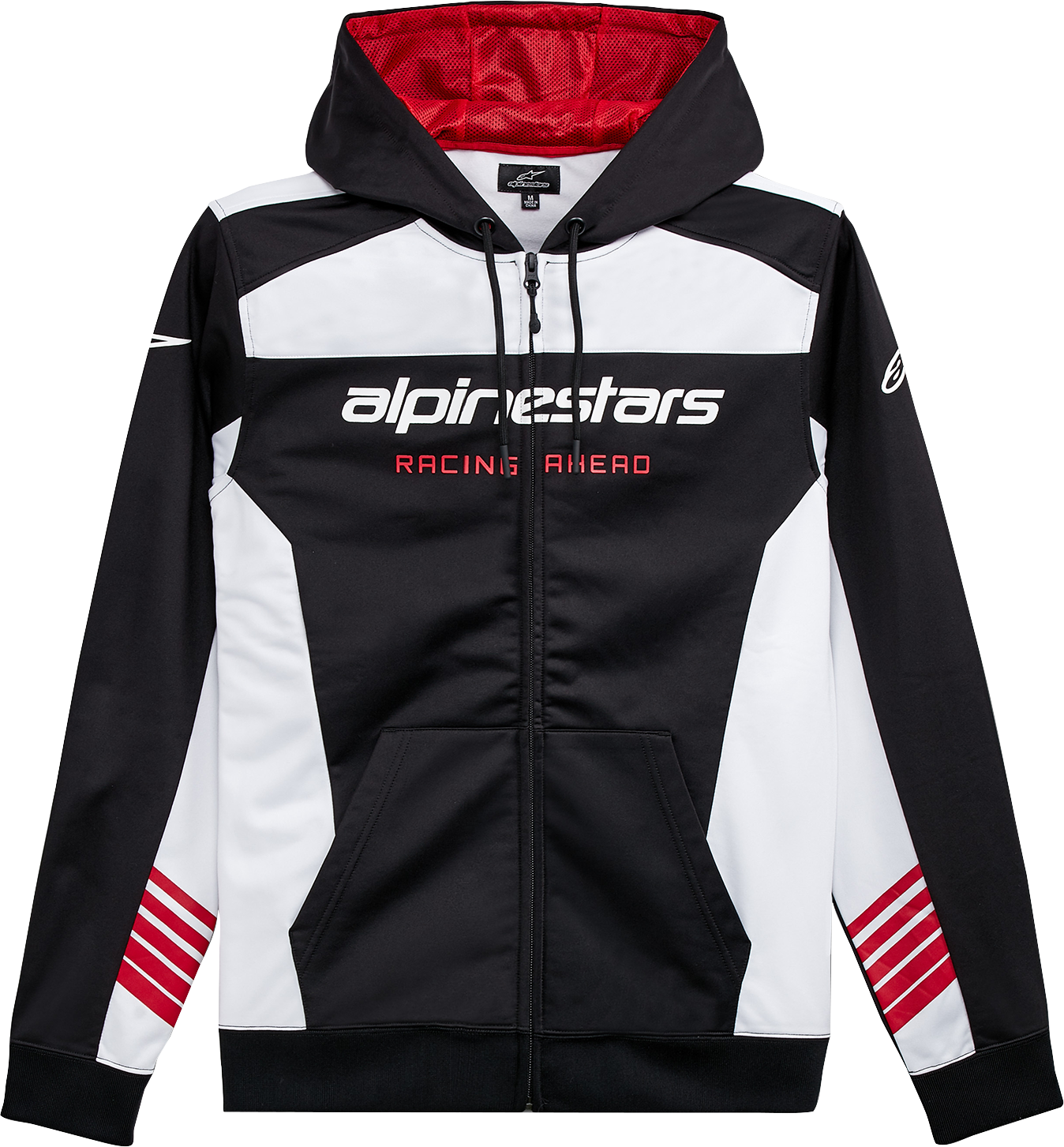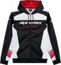 Hooded zip-front 100% polyester fleece with contrast panels, Mesh lined hood, tech draw cords, rib cuffs and hem, Alpinestars word logo and graphics on chest and arms, Internal main label and external label branding