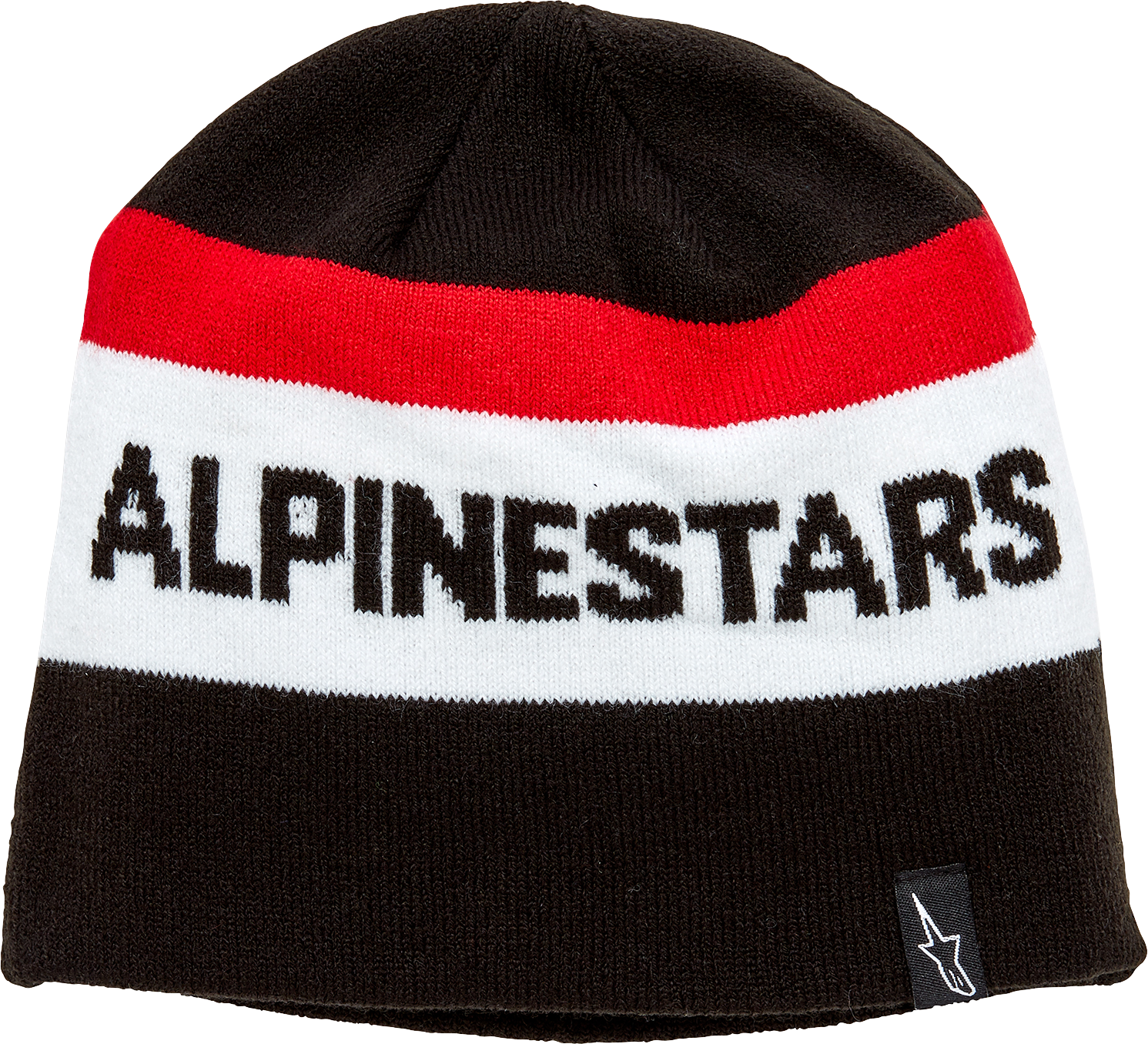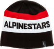 Standard shape knit jersey beanie, Jacquard stripe with Alpinestars word logo, Woven label at cuff